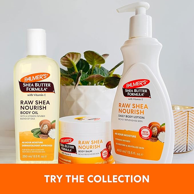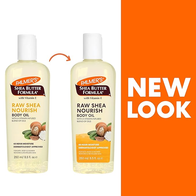 - Moisturizing Body Oil: Palmer's body oil is crafted with raw African Shea butter and vitamin E, soothing & nourishing dry, sensitive & eczema-prone skin. Instantly absorbs without any greasiness or mess, and provides 48 hour moisture