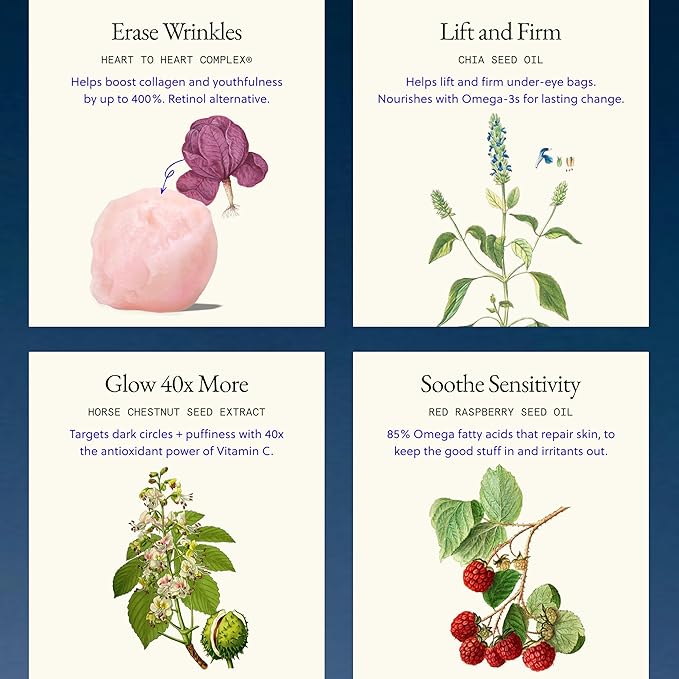 - Boosts Skin Health with Root Cause Skincare: Our Heart to Heart Complex enhances collagen production and skin regeneration using Squalane and Hyaluronic Acid for deep hydration. Horse Chestnut Extract helps reduce puffiness and dark circles, while Chia Seed Oil revitalizes the under-eye area, promoting a healthier, more youthful appearance.