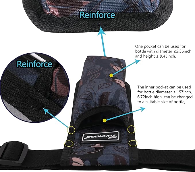 - 3、The design of the Fanny pack: The design of the Fanny pack has three pockets in front and three pockets in front, and two pockets in front.One pocket can be used for bottle with diameter ≤2.36inch and height ≤ 9.45inch. The inner pocket can be used for bottle diameter ≤1.57inch, 6.69inch high, can be changed to a suitable size of bottle;