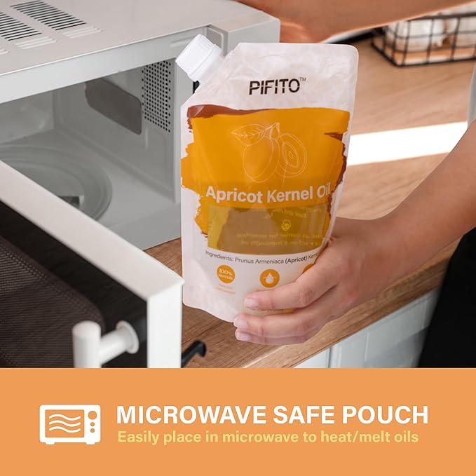- MICROWAVE SAFE POUCH - Oils come inside an easy to pour pouch. Simply place the soap making supplies Apricot Kernel Oil pouch in a microwave or double boiler, to melt solid oils to a liquid. Keep clean by saving remaining oils for later use.