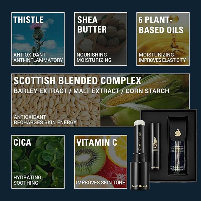 - HYDRATING & NOURISHING LIP BALM STICK: Scott Hamish's lip balm contains moisturizing and repairing ingredients like Black Tea Extracts, Vitamin C, and 6 Essential Oils to exfoliate and soften your lips. This lip mask with Vitamin D prevents your lips from getting and appearing chapped, creating lively, healthy, and kissable lips.