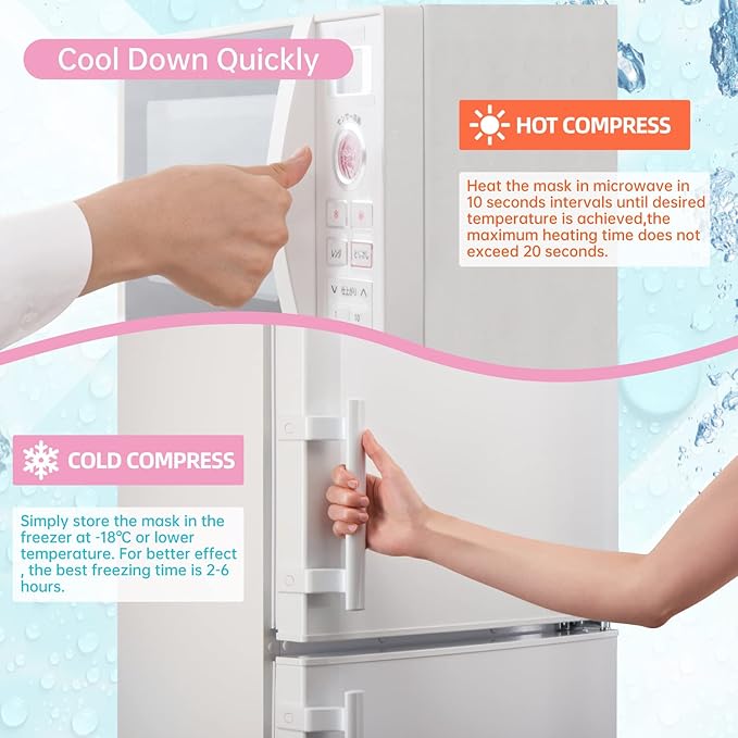 - 【CONVENIENT TO USE】Sealed the eye mask in a plastic bag and simply store the mask in the freezer at -18℃ or lower temperature for at least 1 hours. For better effect,the best freezing time in the freezer is 2-6 hours .For heat therapy,heat the mask in microwave in 10 seconds intervals until desired temperature is achieved,the maximum heating time does not exceed 20 seconds. And the best therapy time is approximately 15 minutes recommended by doctor and therapist.