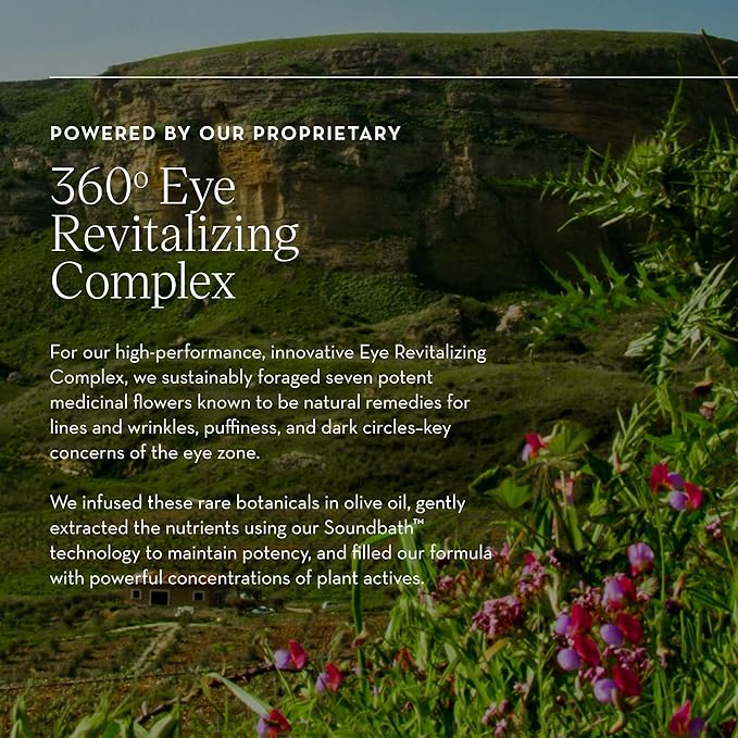 - 360º Eye Revitalizing Complex: A proprietary blend of 14 wild-foraged plants, including artichoke and dandelion, to lift, awaken, and revitalize the extended eye area.