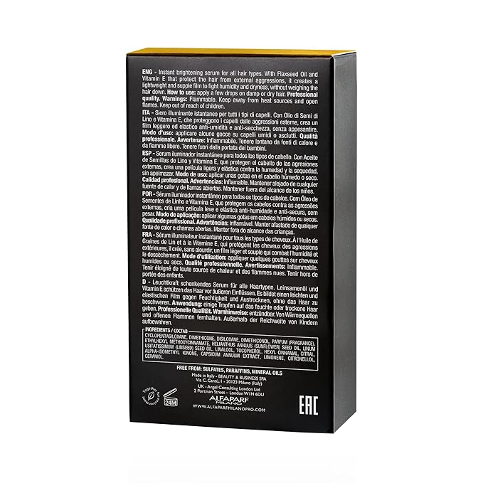 - PROFESSIONAL ITALIAN BEAUTY CARE: Formulated and made in Italy. Active ingredients include Flaxseed Oil, which give hair instant, long-lasting gloss and shine, and a Vitamin E Complex with antioxidant properties and benefits.