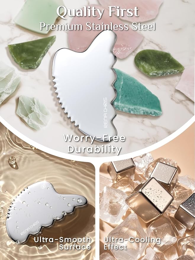 - Excellent Materials:Rena Chris gua sha tool is made of 100% premium stainless steel; the stainless steel guasha is self-cooling and suitable for sensitive skin, making it the best choice for gua sha beginners