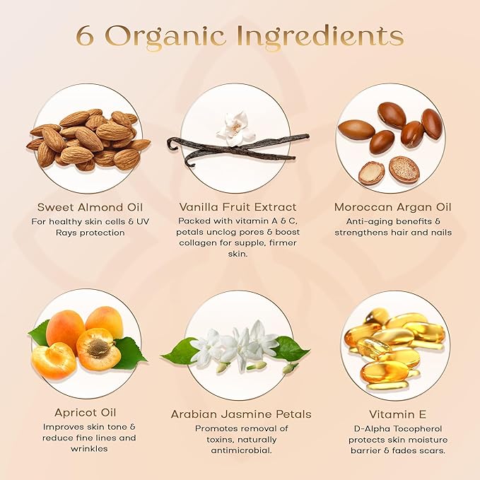 - VANILLA AND JASMINE: The vanilla orchid is hand-pollinated by harvesters with its pods dried and cured to perfection. It is then bottled to let the potent extracts restore the skin and promote hair strength. It is a symbol of warmth, purity, and simplicity. Arabian Jasmine with its bright white petals are picked and dried and infused with a formula that melts into your skin. Its botanical properties hydrate and increase the skins elasticity.