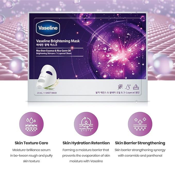 Vaseline Face Facial Mask Sheet Skin Care Essence, HYDRATION RETENTION, SKIN BARRIER REINFORCEMENT [Made in Korea] 10 Count (10 Count, Brightening)