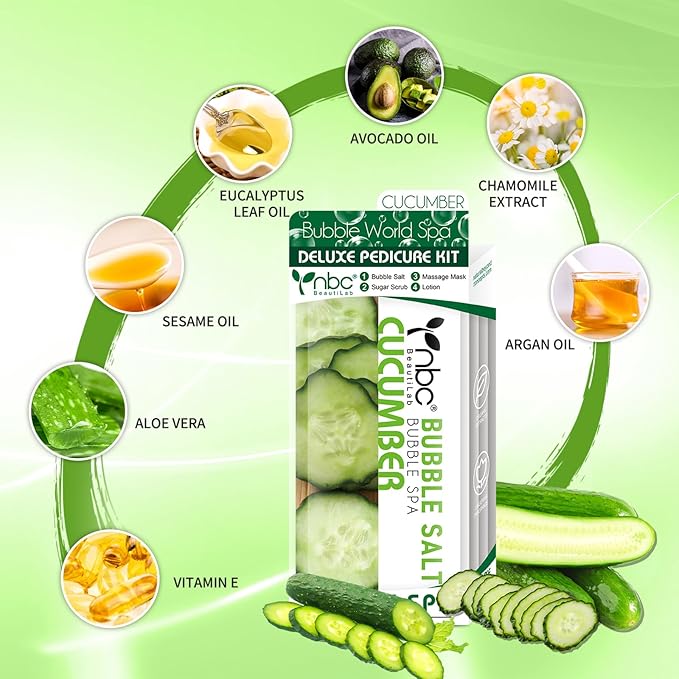 Pedicure Kit Foot Soak Set: Bubble Salt, Sugar Scrub, Massage Mask, Massage Lotion in a Box, 4 Step Foot Spa Kit for Dry Feet, Softens Calluses(3 Set Cucumber)