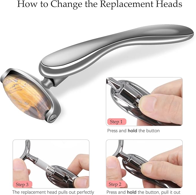 - You can change from the larger jade head to 2 other for cheek and eyes. There is a plastic clip on the heads that snap into place. You have to push in on the clip so its not in the hole and pull up on the head very hard, because it goes in the top of the handle tight so it’s not loose when using it. All 3 heads have a clip and go on tightly.