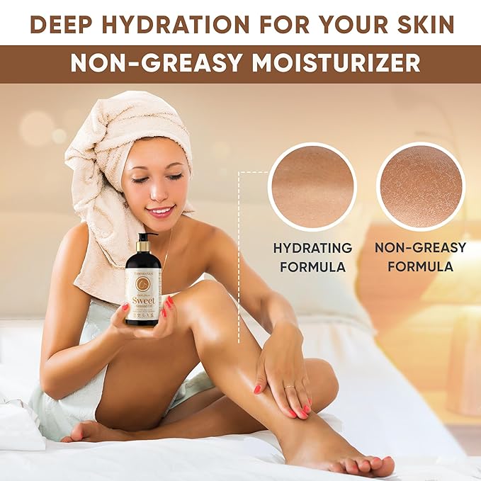 - NON-GREASY — Our almond oil is like a gentle hug for your skin and hair. It keeps them moisturized without any heavy, oily stuff. No more worries about feeling too greasy.