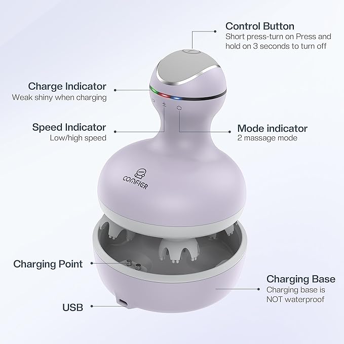 - Portable & Rechargeable: Comfier electric hair scalp massager is powered by a rechargeable lithium-ion battery, eliminating the need for constant plugging in during use. It comes with a charging base and a USB charging cable, and a single full charge lasts for hours. Its compact and cordless design allows you to enjoy a rejuvenating massage anytime, anywhere.