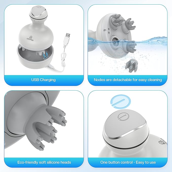 - [Deep head massage] COMFIER electric head massager has four massage heads with 28 nodes. 3D deep kneading and hand simulation can promote blood circulation, help hair growth, relax nerves, relieve stress, and improve sleep quality.