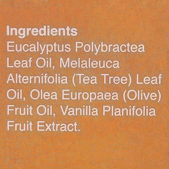 - ALL NATURAL - A unique mixture of only 4 natural ingredients: Tea Tree Oil, Blue Mallee Eucalyptus, Vanilla, and Olive Oil.