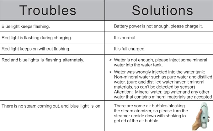 - 【NOTES FOR BUYERS: 】1.the steam area of this handheld facial steamer is less than regular plugged in facial steamer. But it can be compensated by handy mobile use; 2. Use drinkable mineral water and filtered tap drinkable water;Prohibit essential oils,liquid cosmetics,pure or distilled wate. 3.if It barely steams at all and it is a cool mist. Then it shuts off quickly. please check if the water used is mineral water and shake the machine vigorously .4.Storing water for a long time without use, you need to vigorously shake the machine several times
