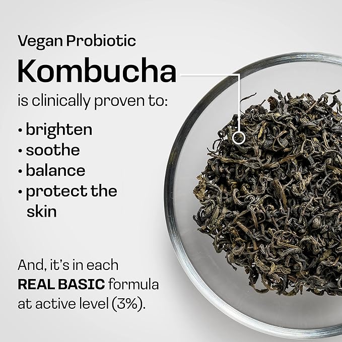 - Serum for Anti-Aging is also formulated with Kombucha at an active level of 3%. Kombucha is an extraordinary breakthrough ingredient that’s clinically proven to help brighten, soothe, balance, and protect the appearance of your skin. Probiotics in skincare is one of the biggest beauty trends, with Kombucha leading the way as a vegan all-star.