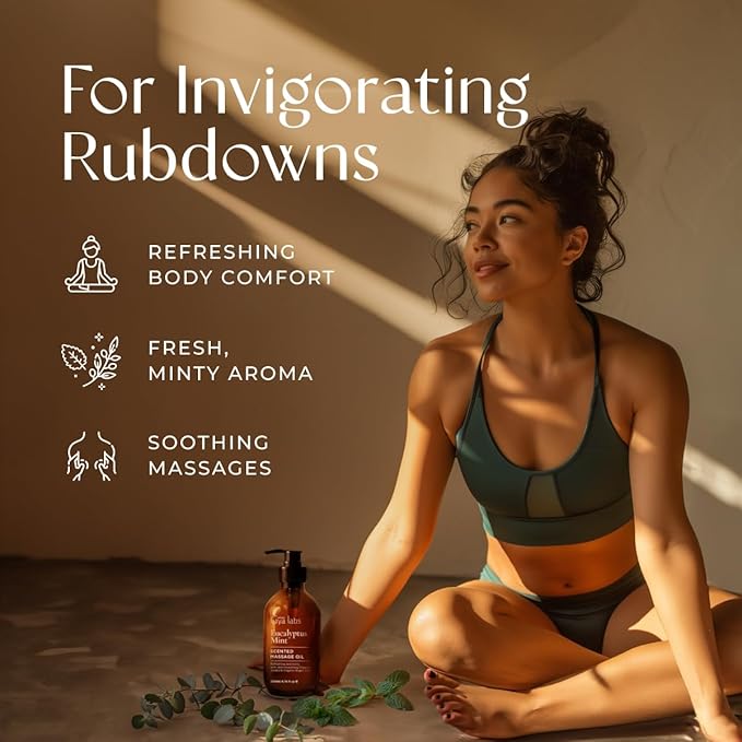 - A truly mesmerizing body massage oil. Gya Labs’ Eucalyptus Mint Massage Oil is a nourishing botanical infusion of argan carrier oil, jojoba carrier oil, sweet almond carrier oil, sunflower carrier oil, eucalyptus oil, cornmint oil and vitamin E.