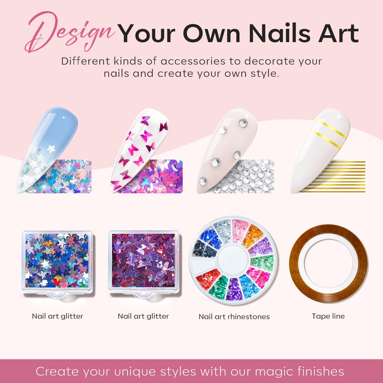 - 【Upgrade Poly Gel Kit】:This complete poly nail gel kits includes: 32*15g Poly nail gel, 8W Nail Lamp, 10ml Base Top Coat Set, 15ML Slip Solution, 48pcs * Dual forms, 20pcs* Nail forms, Brush and spatula, 12* nail art Rhinestones, 5g Rhinestone Glue Gel,6 * Nail art glitters, 2 colors nail striping tape line, 2* Nail french tips , 12 * Cleaning pads, Nail file, Nail tips clip, Nail cutter, Cuticle fork,Cuticle pusher, Nail design brush