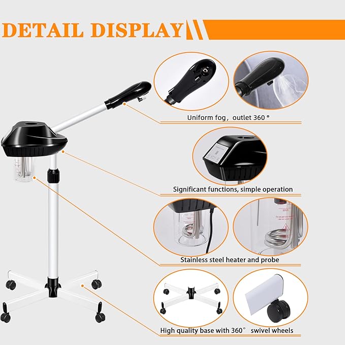 - 【Facial Steamer Professional】The facial steamer comes with an upgraded atomizing cartridge, removable 500 ML water cup, 36-52 inch adjustable height, 360° rotating nozzle, and 360° rotating body.