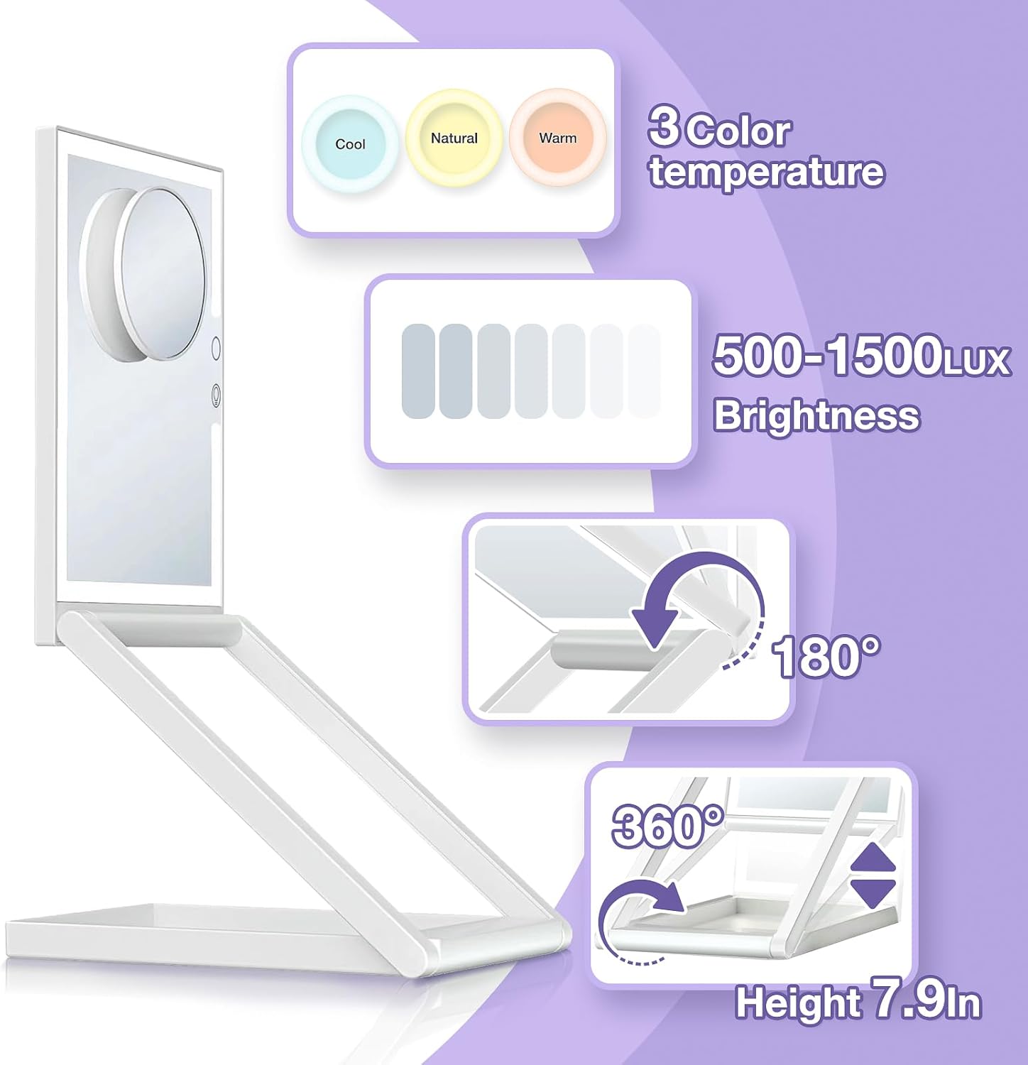 - 3 COLOR DIMMABLE LED MIRROR:Simply touch the screen can turn on/off the lights, our travel lighted makeup mirror offers 3 delicate light colors (cool, natural and warm) with each adjustable brightness color mode for you to catch every exquisite makeup moment.