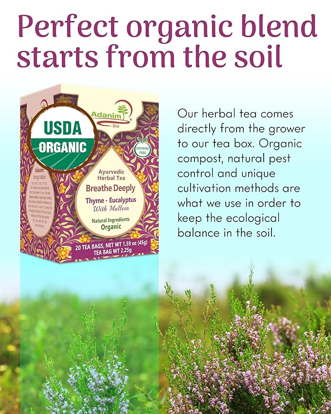 - Breathe Easy Tea: Experience the soothing goodness of Adanim Bio Eucalyptus Tea, a blend of eucalyptus leaves tea and organic thyme tea with mullein tea bags, thoughtfully crafted to support respiratory well-being.