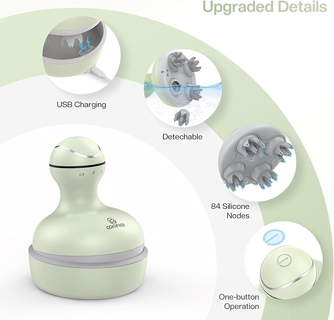 - Advanced Design: The head scratcher adopts an ergonomic grip design, which is easier to hold and more comfortable to use. The 4 massage heads are designed to be detachable for easy cleaning, making it possible to maintain health and hygiene while enjoying a comfortable massage. The Electric scalp massager is charged via a charging base and a USB cable for easy and safe charging.