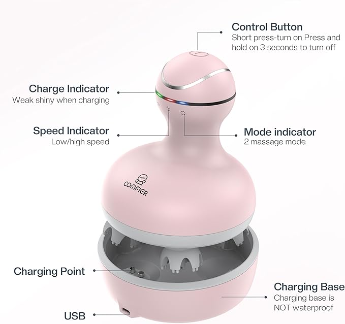 - Rechargeable and Convenient - The Electric Scalp Massager is rechargeable through the charging base and USB cable, and can be used for hours on a single charge. And it's small enough to fit in a handbag, so you can take it with you whether you are going to work or travel, and enjoy head massager scalp stress relaxation anytime, anywhere.