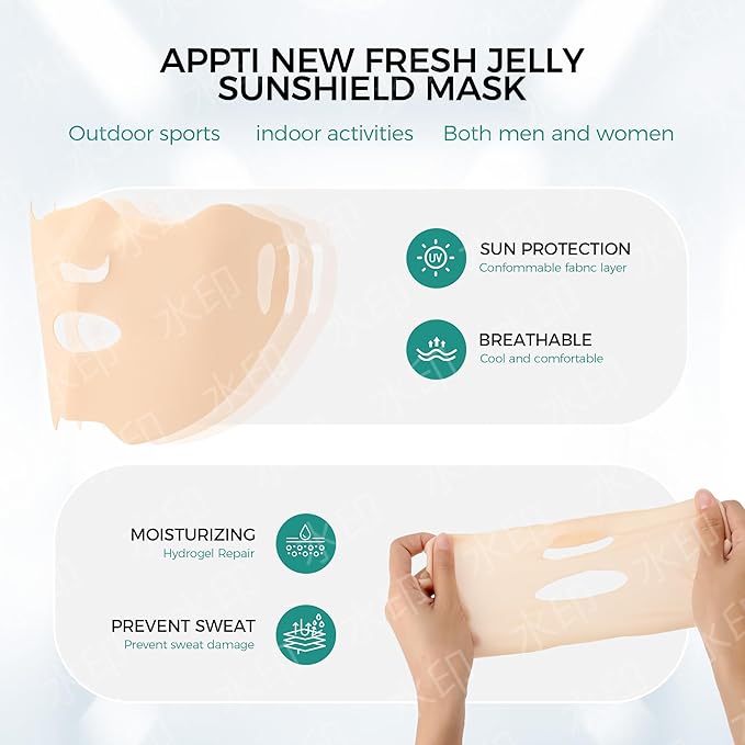 - The jelly sunscreen mask is made of functional elastic fabric, which is breathable and refreshing. It is suitable for various face shapes of men and women. Wearing a sunscreen mask can effectively prevent ultraviolet rays. Please enjoy the comfortable adhesion brought by the mask.