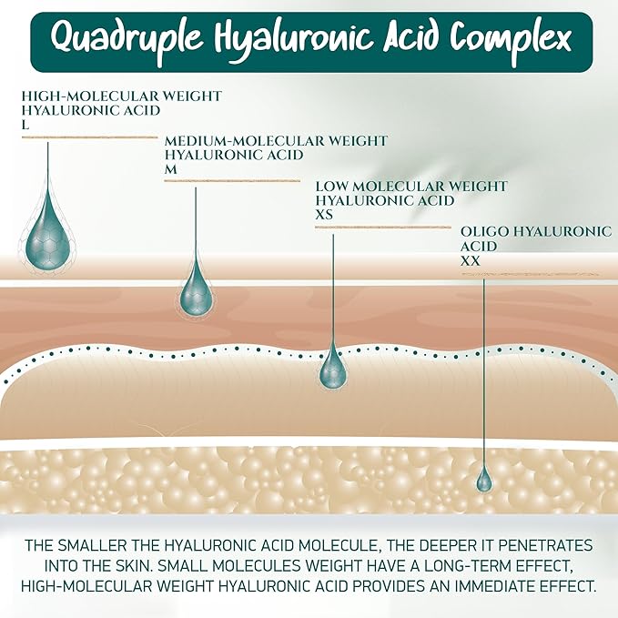 - 4 HYALURONIC ACID SIZES INSTEAD OF JUST ONE - Scientifically proven that the combination of several hyaluronic acid sizes achieves the best effect.