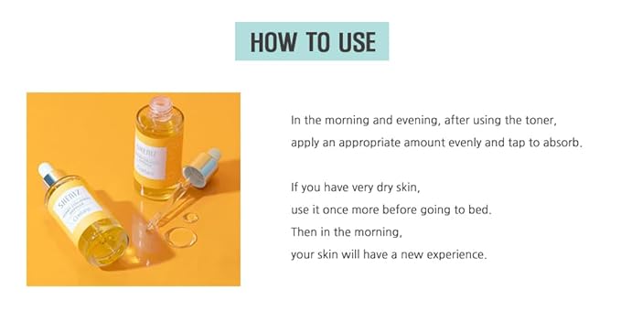 - How to use it: It is recommended to use this facial serum twice a day (morning and night). After washing your face cleanly, take 2-3 drops(Use 2 drops for normal skin and 3 drops for dry skin) and spread them evenly on your face. And tap it lightly and press it with your palm. This will quickly absorb the serum so that you can get the result you want. (If you have a face toner, I recommend using it after the face toner. If you don't have a face toner, use it in the first step after washing your face.)
