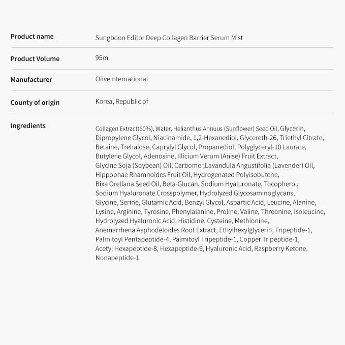 SUNGBOON EDITOR Deep Collagen Barrier Serum Mist | Real Collagen, Multi Peptides, Hydration, Wrinkle Care for Dry Skin, Wrinkles, Korean Moisturizer, Korean Skin Care, Glass Skin Mist, 3.21 fl. oz