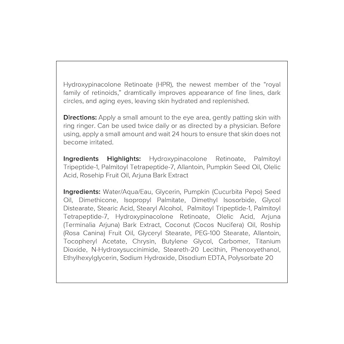 - Maximum Results, Minimal Irritation: The key ingredient is Hydroxypinacolone Retinoate (HPR), a new retinoid powerful enough to visibly brighten and intensively hydrate all while being gentle of the skin. HPR has shown to potentially outperform traditional retinol eye cream!