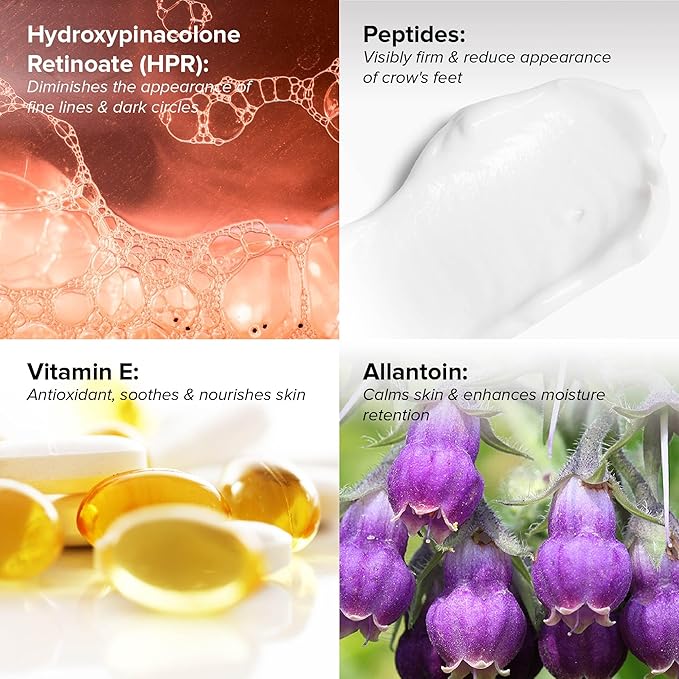 - Gold-Standard Ingredients: In addition to HPR, the eye cream also combines a potent blend of peptides, allantoin & Vitamin E to moisturize and create supple, soft skin.