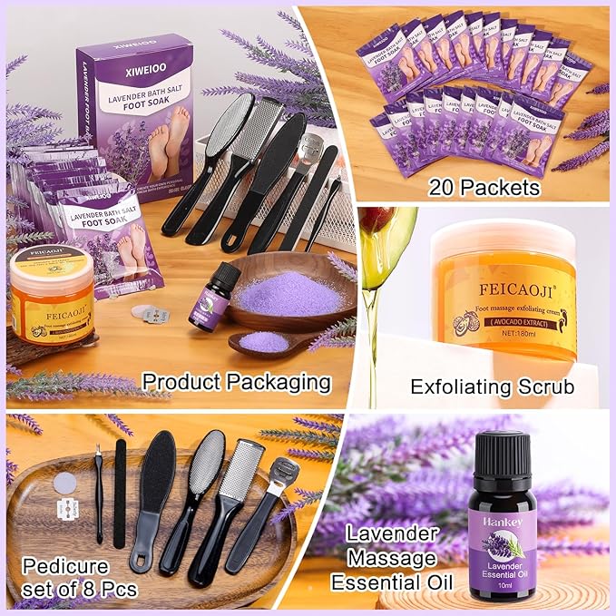- 💕 This product contains: 20 packs of lavender foot bath salts, 1 bottle of exfoliating scrub, Foot bath tool set 8 sets, 20 packs of lavender foot bath bath salts, 1 bottle of exfoliating scrub, foot bath tool set 8 sets, Lavender essential oil bottle. This set is a family foot bath set that meets all your needs for a massage spa foot bath at home. Improve the overall health and appearance of your feet and nails. Gentle, suitable for all skin types.