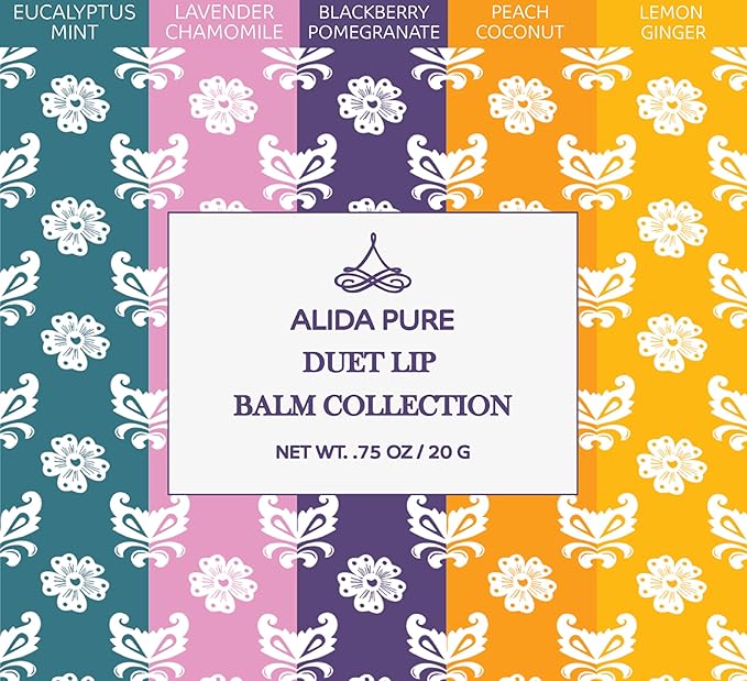 - ALIDA PURE Duet Lip Balm Collection is made with cruelty free, hypoallergenic, organic, and natural oils, that protect, and soothe. The delicious, nourishing, and moisturizing, Duet Lip Balm Collection includes a .15-ounce lip balm tube of Eucalyptus Mint, Lavender Chamomile, Blackberry Pomegranate, Peach Coconut, and Lemon Ginger lip balms. Thoughtfully packaged with biodegradable materials that support the environment.