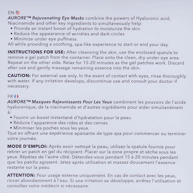 - AURORE Rejuvenating Eye Masks are formulated with high-quality ingredients such as Hyaluronic Acid, Niacinamide, Aloe Vera Extract, Green Tea Extract, Hydrolyzed Collagen, Peptides, and Licorice Extract. These ingredients work together to hydrate, moisturize, and nourish the delicate skin around the eyes, reducing under eye puffiness, fine lines, wrinkles, and dark circles.