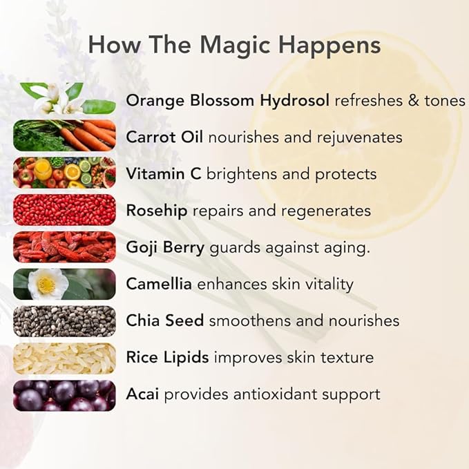 - ANTIOXIDANT-RICH FORMULA: Infused with goji berry, acai, and vitamin C, our antioxidant serum for face offers essential protection against environmental damage while promoting visibly healthier skin. Enriched with carrot oil and camellia, this potent blend acts as our vitamin C serum for face, deeply nourishing and rejuvenating your complexion. Ideal for any antiaging skincare routine, our all-natural skin care product helps protect against premature aging and supports long-term skin vitality.