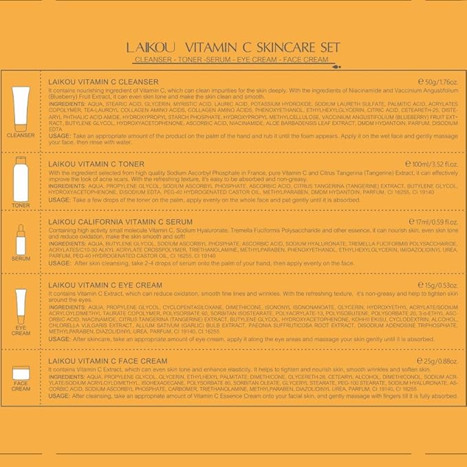 - 🍊【Skin Care Routine Kit】 Vitamin c skincare set for teenage girls. The 5-piece skincare set meets your daily skincare needs and the travel skincare set is the perfect skincare companion for your travels. Elevate your skincare routine with this comprehensive moisturizing essentials: facial cleanser, face toner ,hydration face serum, face cream, and eye cream.
