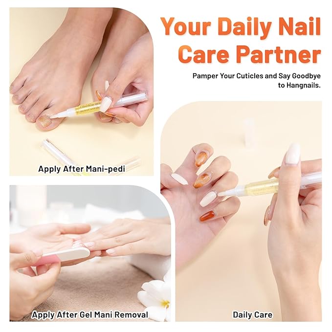 - 【Easy To Use】 - For first time use, keep clockwise twisting the grip of the nail polish tube and wait for 1-2 minutes until the polish drips off.Brush the oils onto your cuticles and the surrounding skin.Gently massage,3-4 times a week.Note: Cover the cap after use.
