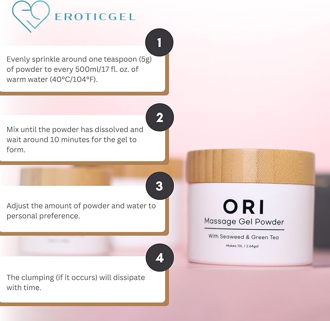 - Our Massage Gel Powder is made with natural ingredients like seaweed & green tea, offering a safe and nourishing massage experience. It’s free from parabens and glycerine for peace of mind.