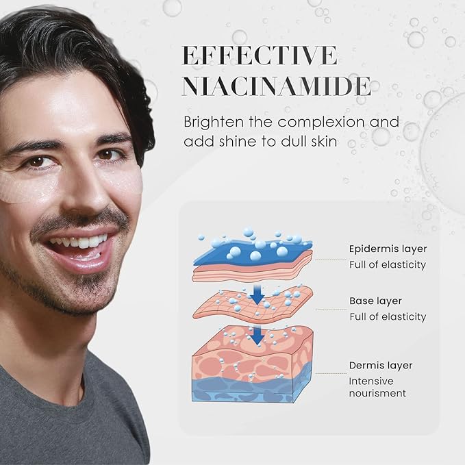 - Niacinamide: These eye patches for adults help repair damaged skin around the eyes, brighten the complexion and add shine to dull skin. Patch our under eye gel pads, no more tired eyes. Look fresh after dark circles under eye treatment for women or men.