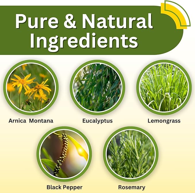 - MADE WITH PREMIUM QUALITY, ALL NATURAL INGREDIENTS - Sweet Almond Oil, Grapeseed Oil, Jojoba Oil & Arnica Montana Oil are perfectly blended and enriched with Eucalyptus, Lemongrass, Rosemary & other essential oils to create this exquisite body massage oil.