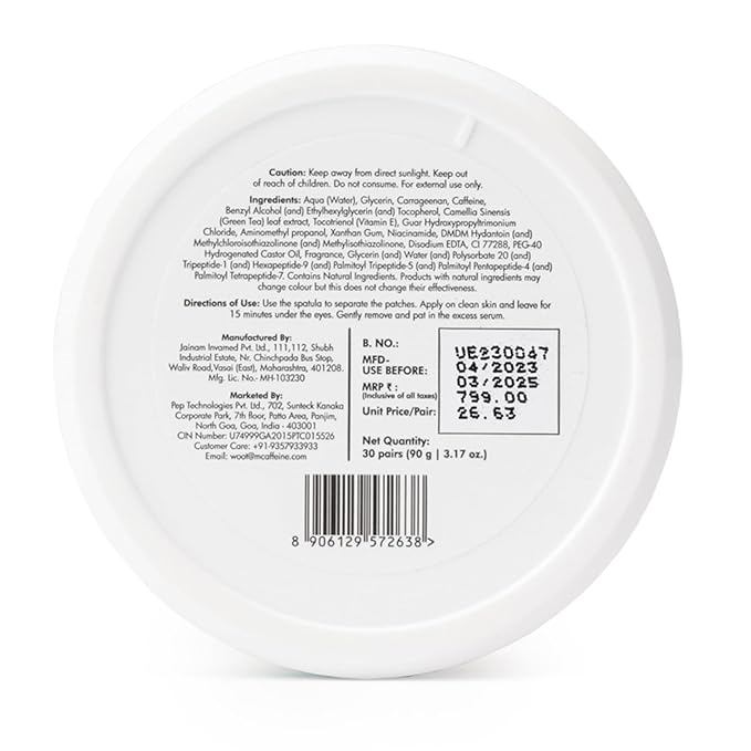 - COOLING EYE PATCHES CONTOURED FOR RIGHT FIT: Thoughtfully contoured to fit anyone and everyone's under eye area effortessly, these under eye patches enriched with 1% Caffeine & Green Tea Extracts smoothe the texture around the under eye area in 15 minutes.