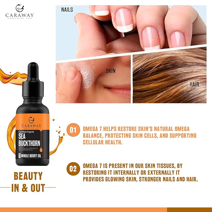 - OPTIMAL OMEGA-7 – CARAWAY Sea Buckthorn Berry Oil is a blend of Whole Berry Oil with small amount of Seed Oil for Optimal Omega-7. Dosage of 1 ml would equal 2 Capsules of 500mg. It can be used as a Dietary Supplement and can also be applied Topically to address various Skin Problems.