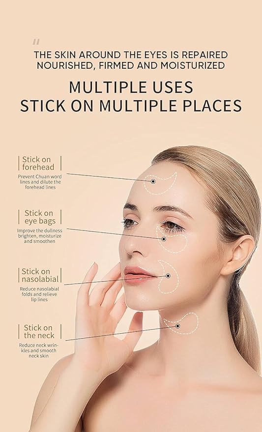 - 🌟 Extra Usage Tip: You can also apply the Hydrogel Patches at the neck, around the mouth & forehead as an anti-wrinkle and dryness solution since they will adhere to any part you apply them to allow the skin to absorb all the ingredients targeting the wish area and obtaining the same benefits listed above.