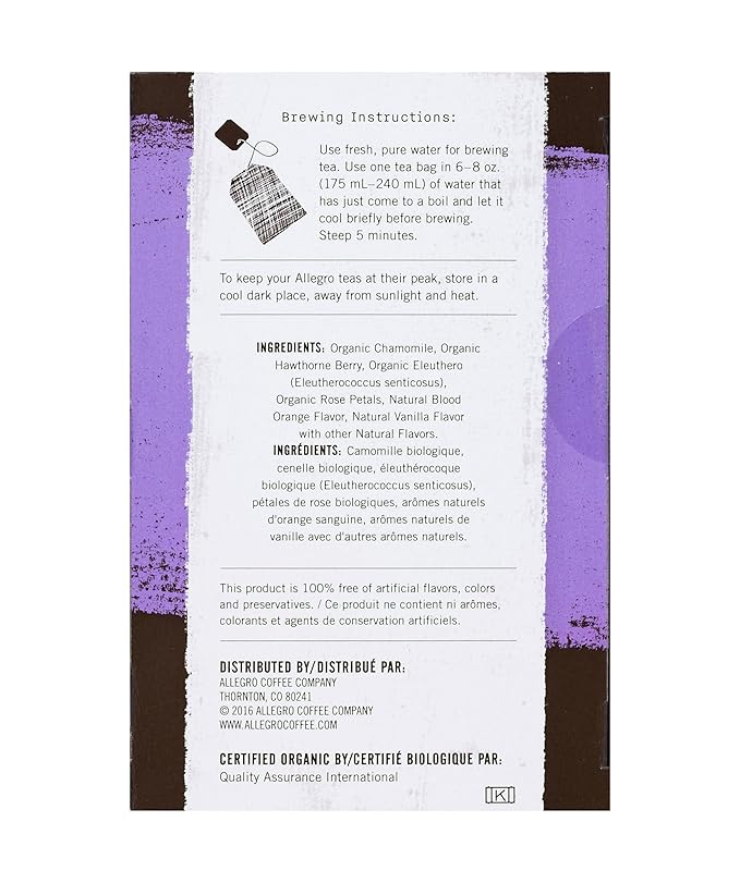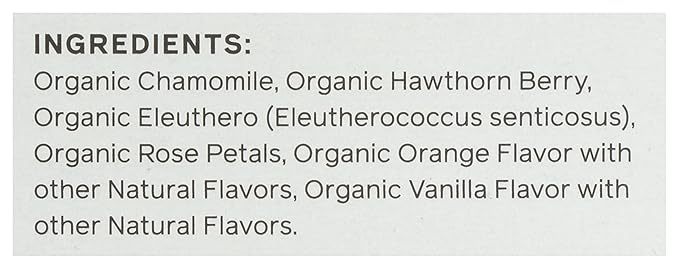 - Organic Chamomile, Organic Hawthorne Berry, Organic Eleuthero (Eleutherococcus senticosus), Organic Rose Petals, Natural Blood Orange Flavor, Natural Vanilla Flavor with other Natural Flavors.