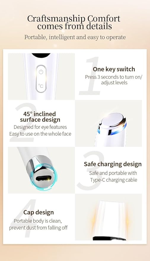 - 4.Portable and Convenient: Our Eye Massage Wand is compact in size, making it easy to carry and ideal for travel. It can be charged through various devices using the provided USB cord, such as PCs, power banks, etc. This makes it extremely convenient to use, anytime and anywhere.