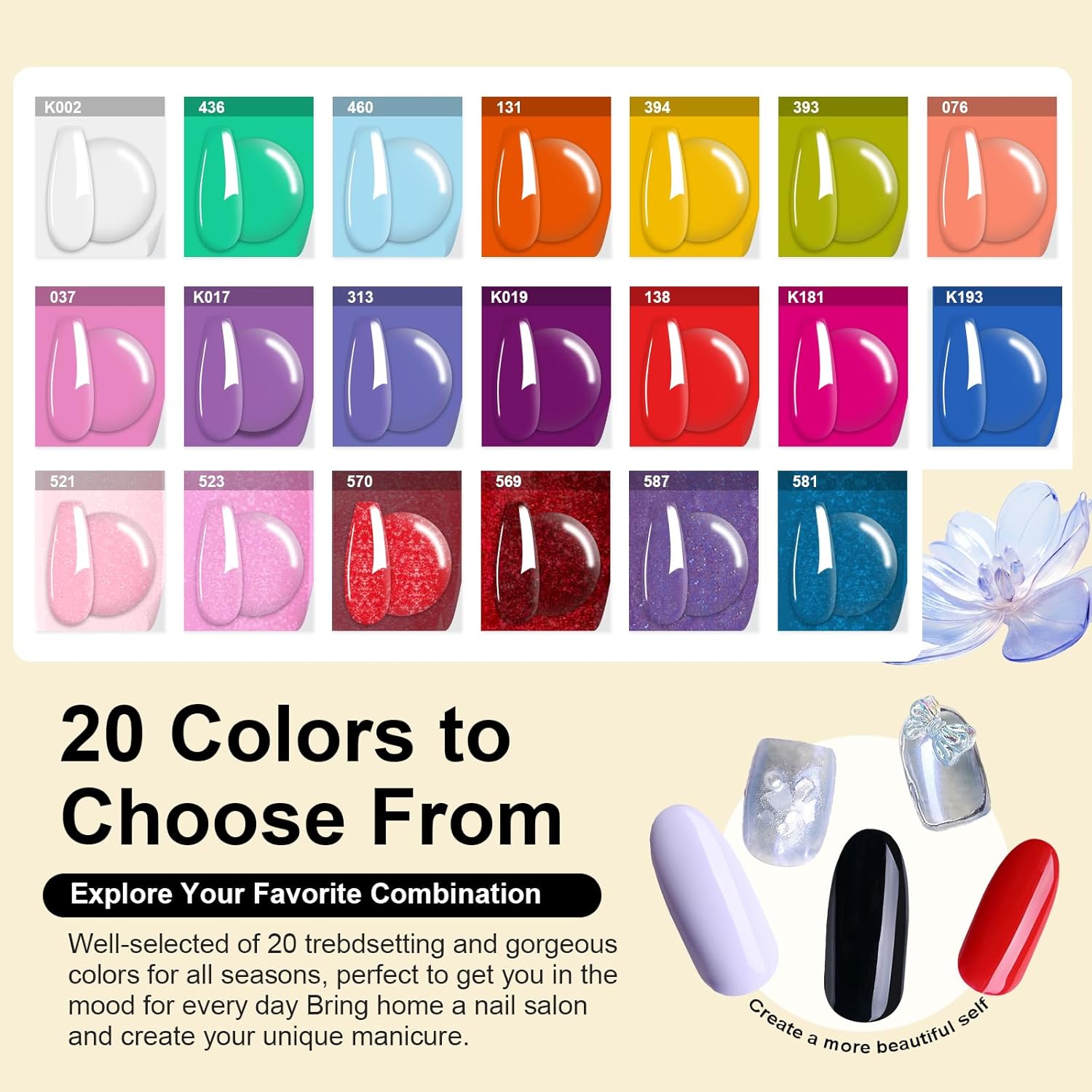- 【What You Get】Dip Nails Powder Starter Kit including 20*0.35oz dip powder, 4*0.5floz dip liquid set, 1* Nail Brush, Cuticle Pusher*1, 1*Nail file, Substitute brush*2, Nail Stick*2. A kit containing all your nail art needs.