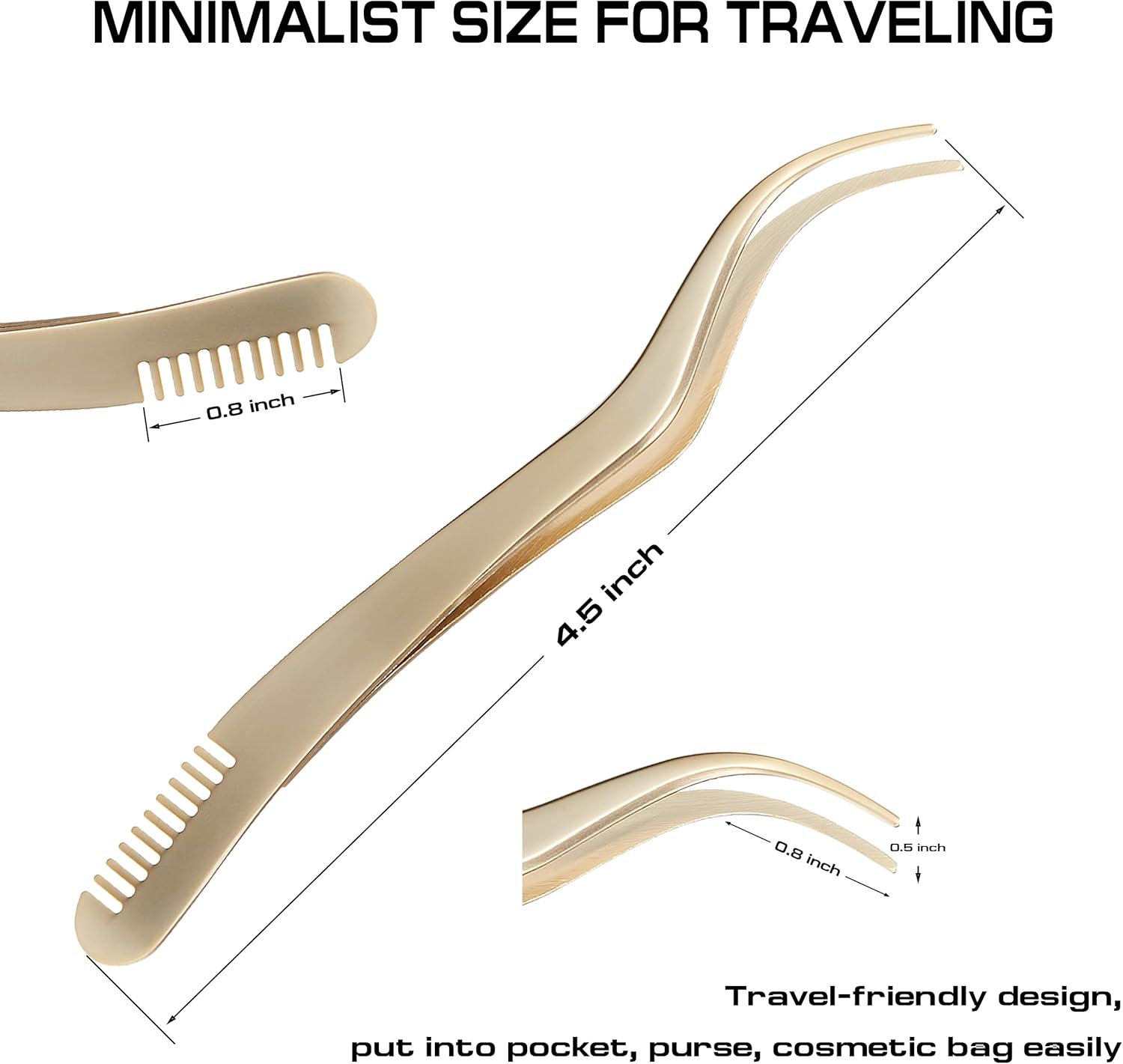 2 in 1 Lash Tweezer with Comb, Eyelash Extension, Stainless Steel Elbow Tweezers, Precise Eyebrow Tweezers Tool, Lashes Tweezer Applicator for DIY Applying False Eyelashes Clusters, Gold