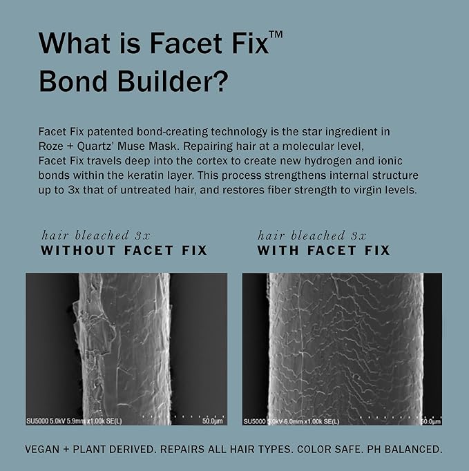 - Facet Fix plant-derived bond builder repairs at a molecular level; it strengthens internal hair structure up to 3x that of untreated hair, creates additional hydrogen and ionic bonds within the hair’s keratin structure, penetrates deep into the cortex and restores fiber strength to levels of virgin hair.