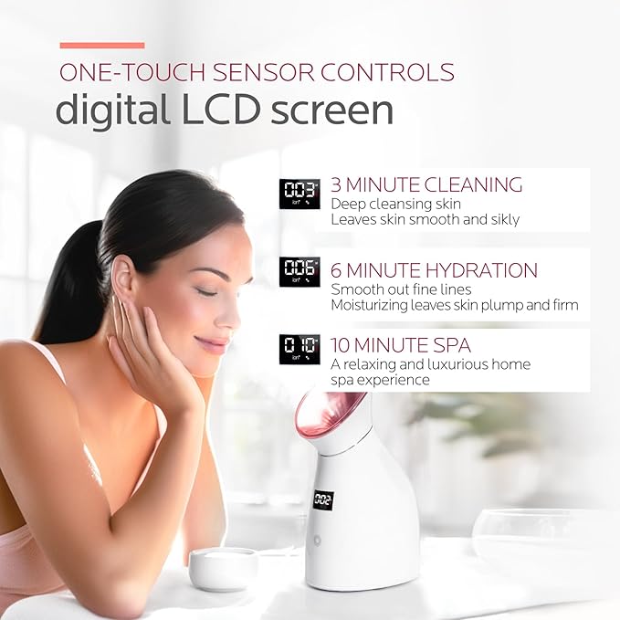 - Professional Facial Care: Upgrade face humidifier with LCD screen timer and smart touch switch. The face steamer for facial takes only 10 seconds to release a fine mist of nano ionic steam, gently cleansing deep within your pores and opening up your skin's absorption channels. Enjoy a comfortable at-home spa experience with a soothing steam temperature of 104℉ and an 15-minute runtime.